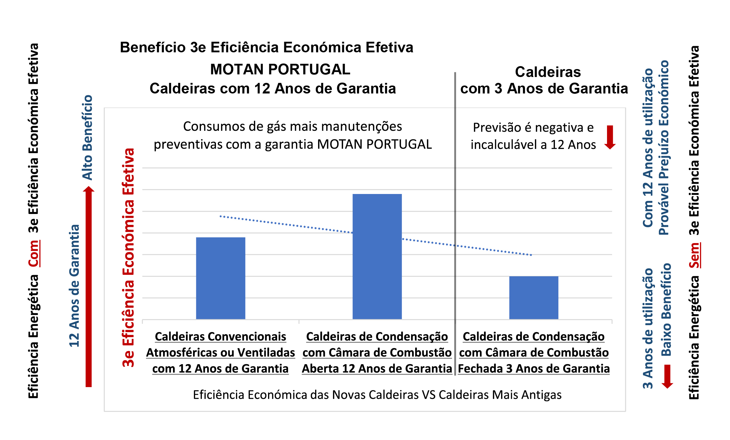 Após um estudo efetuado, verificamos que com uma caldeira de condensação com câmara de combustão fechada o resultado para o cliente final é sempre negativo em mais de 9% versus a aquisição de uma caldeira convencional da classe PREMIUM da MOTAN KÖBER PORTUGAL devido à elevada qualidade dos nossos equipamentos nos permitir oferecer 12 Anos de Total Garantia. São 12 Anos a 0€ em caso de avarias o que não acontece com as caldeiras de condensação com câmara de combustão fechada. São 12 Anos sem a utilização de recursos a inspeções, reparações ou avarias para o bom funcionamento da caldeira convencional. Caldeiras com 3e Save Money é um exclusivo da MOTAN KÖBER PORTUGAL.